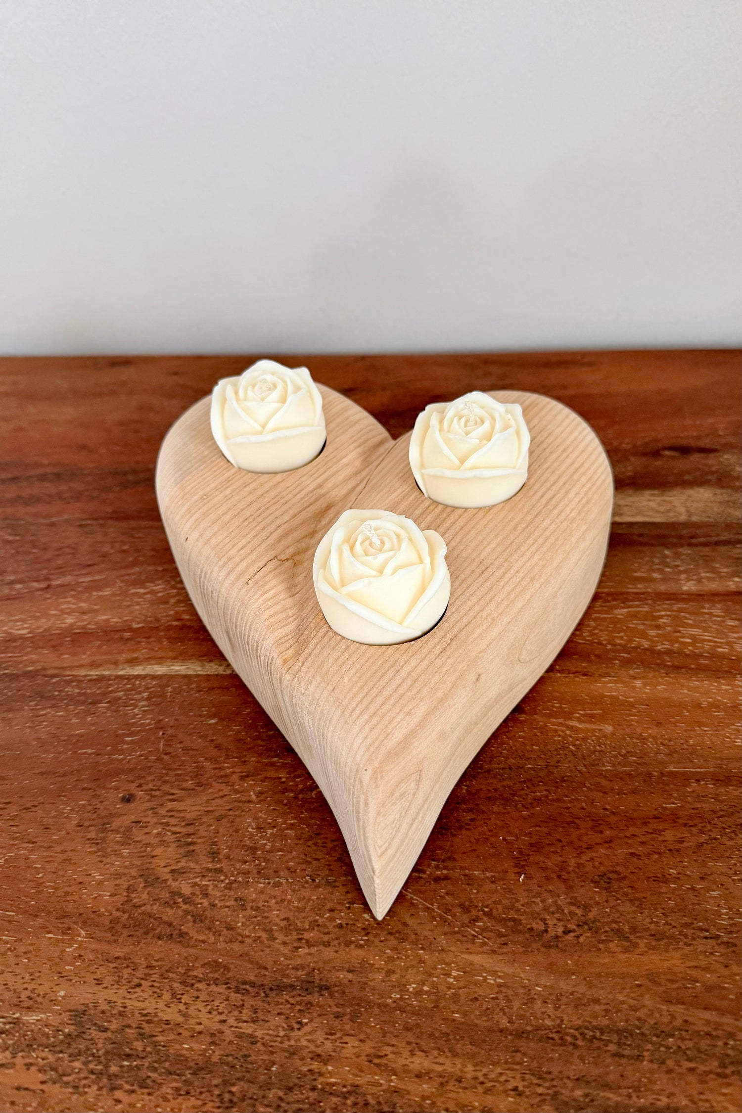 Herz aus geschliffenem Eichenholz liegend mit Designkerzen 1594