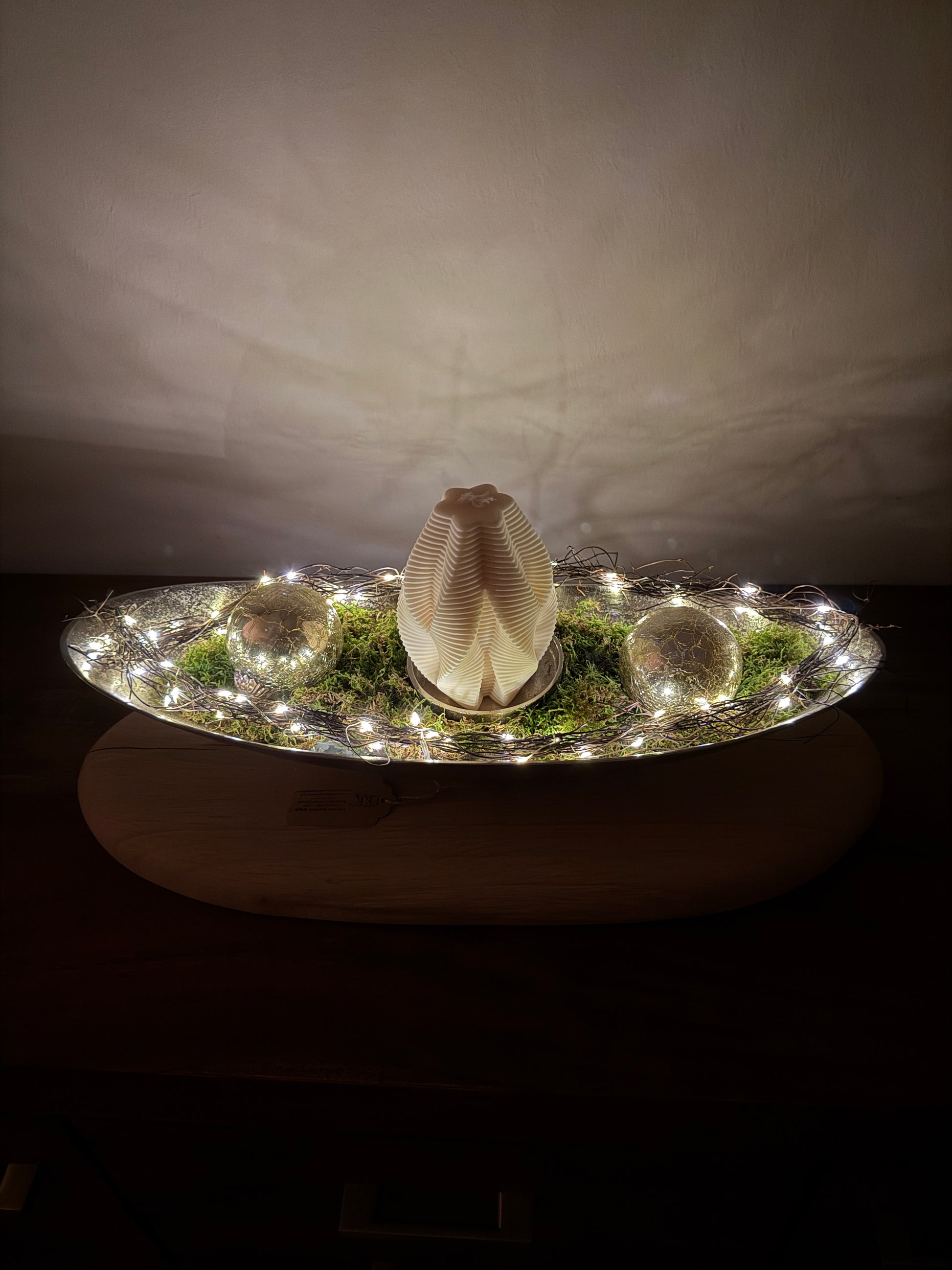 Dekoschale silber groß auf Holzstamm geschliffen mit Designkerze und weihnachtlicher Deko 1514