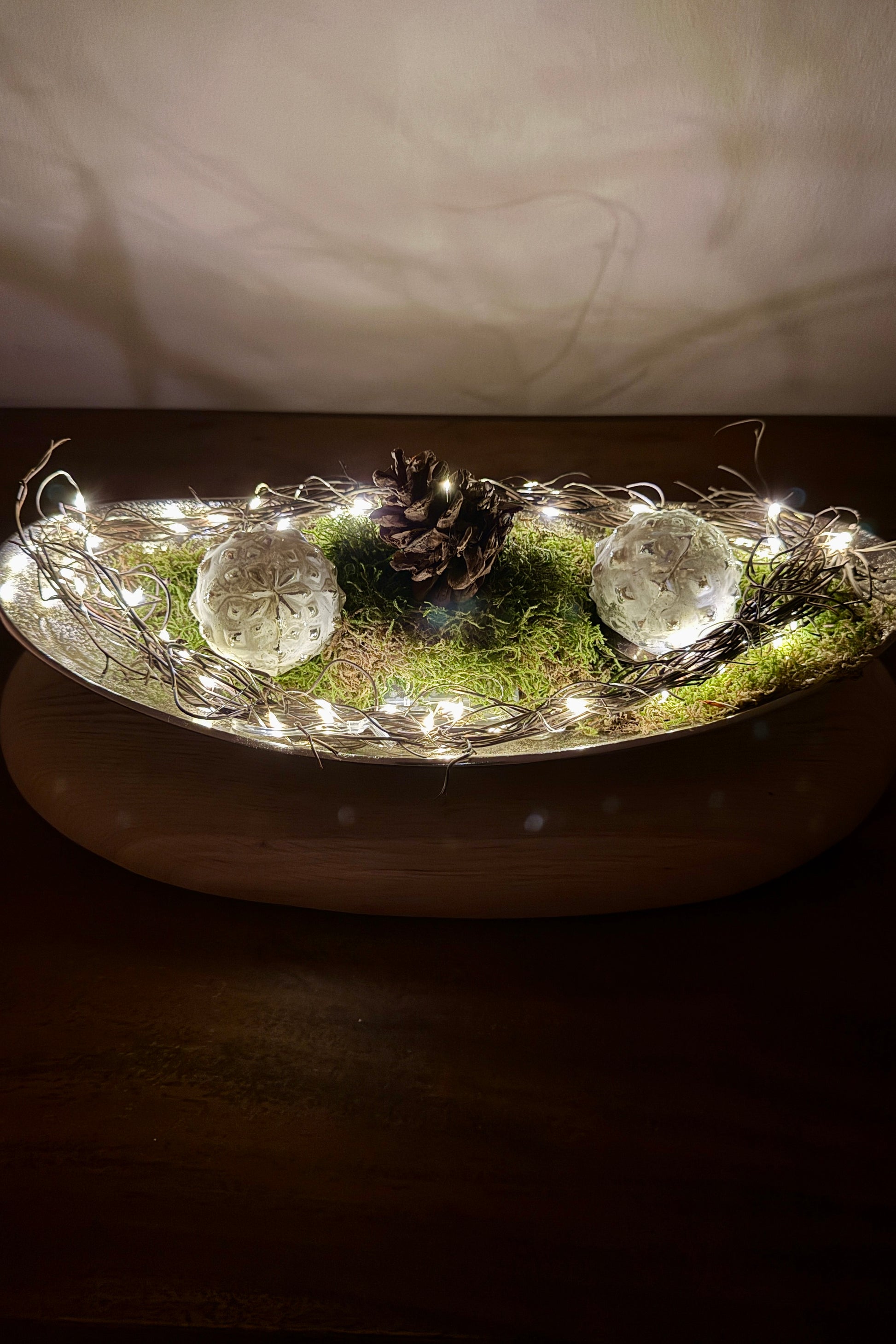 Dekoschale silber klein auf Holzstamm geschliffen mit weihnachtlicher Deko 1509