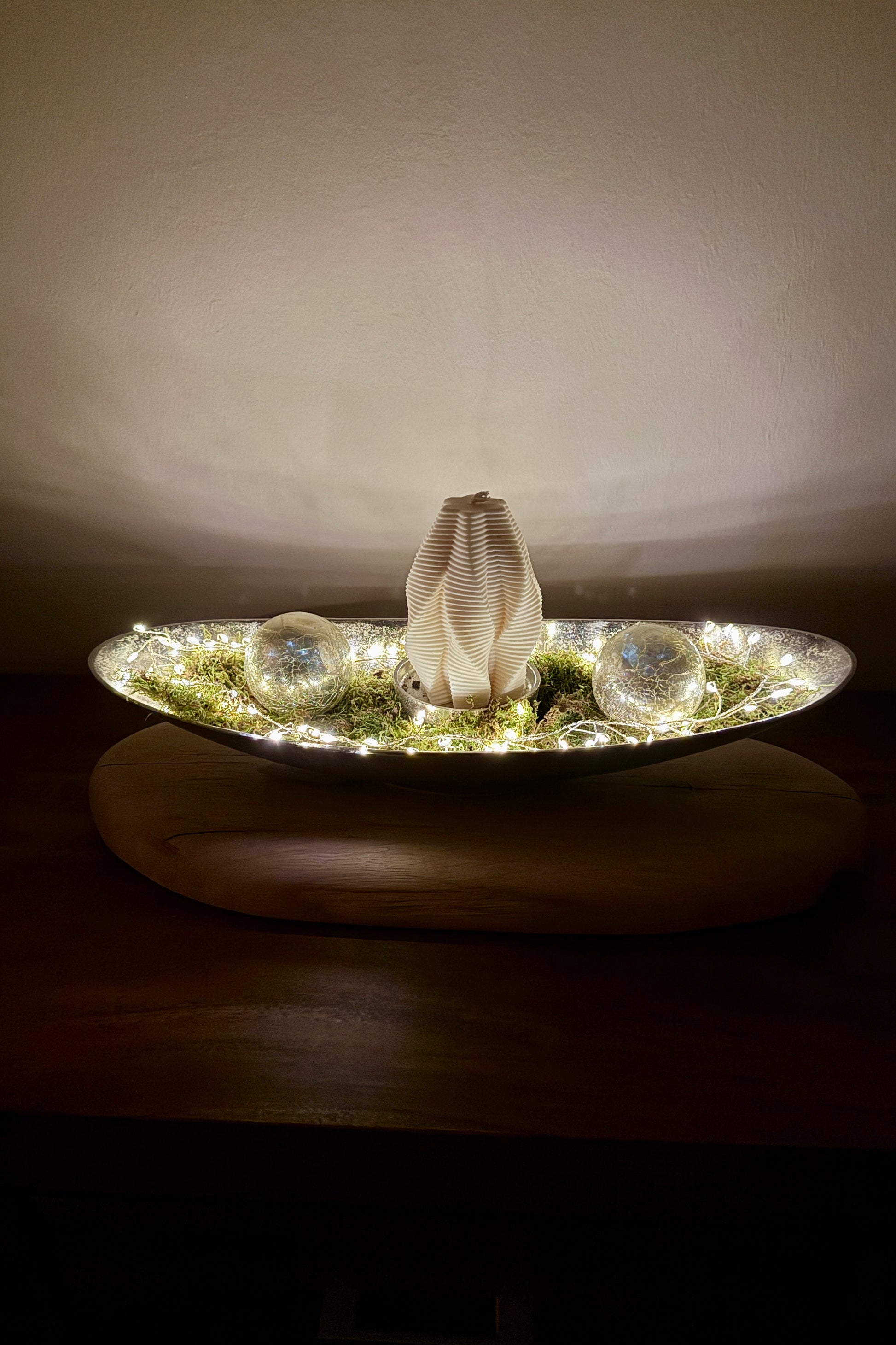 Dekoschale silber groß auf Holzstamm geschliffen mit Designkerze und weihnachtlicher Deko 1513