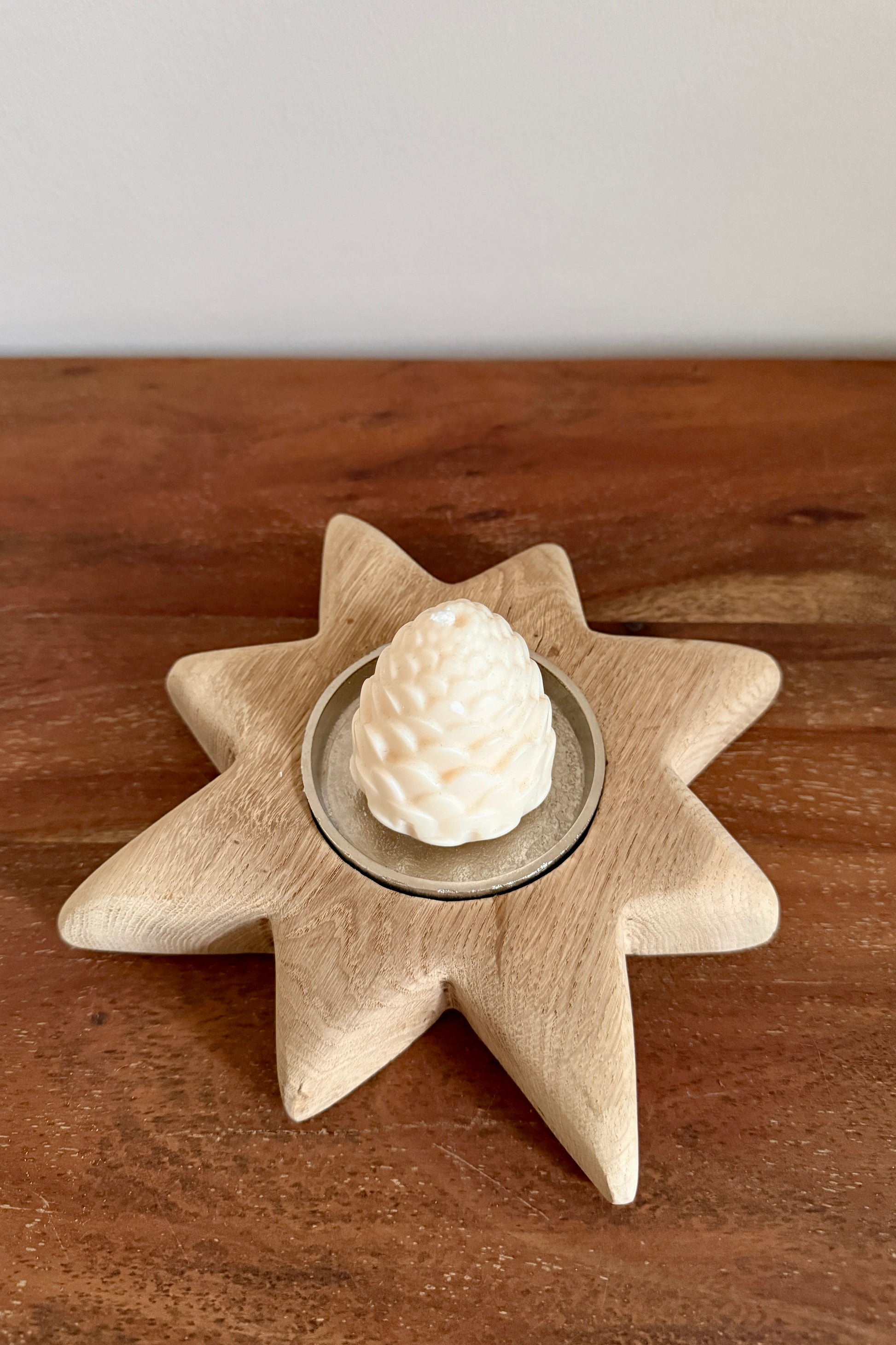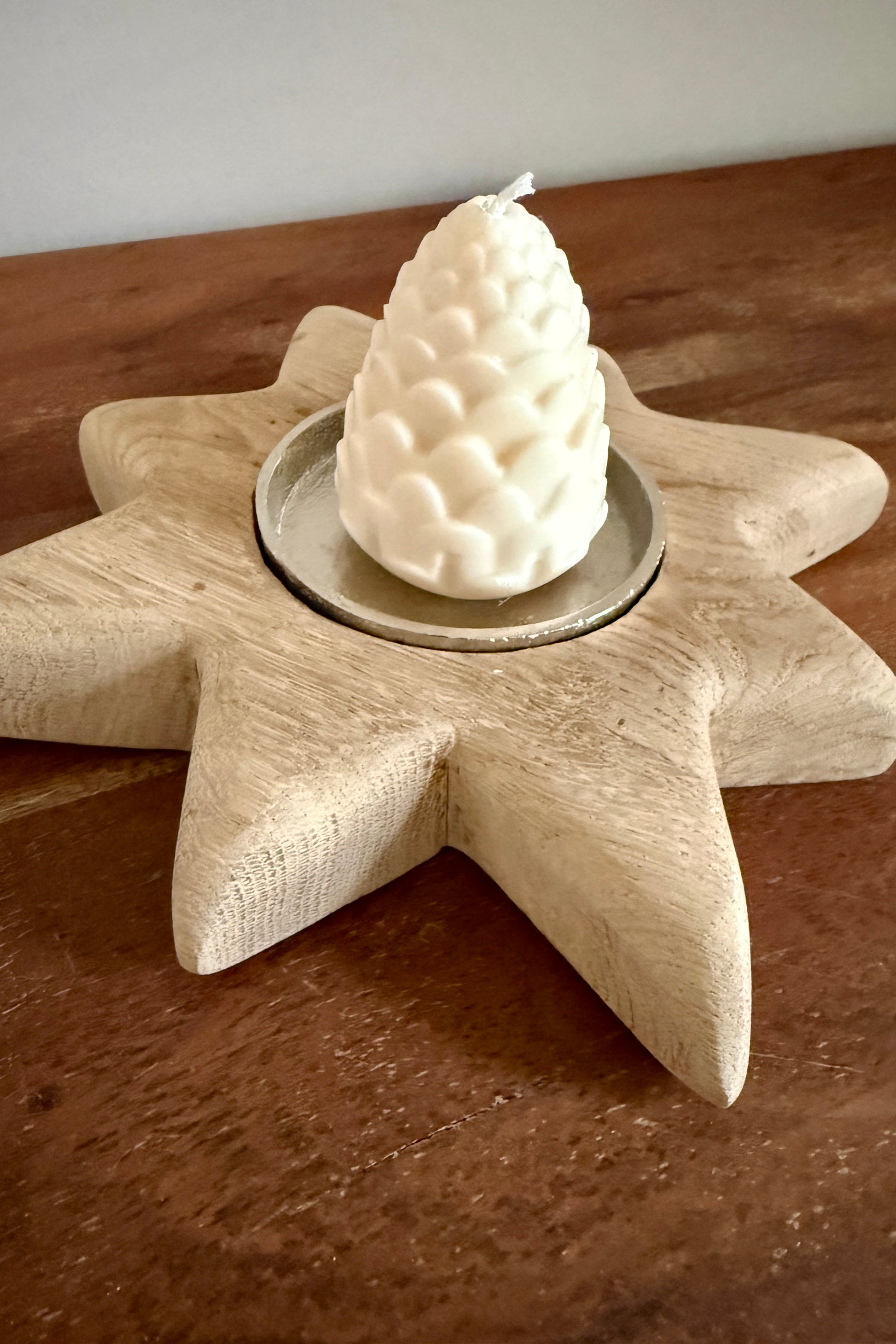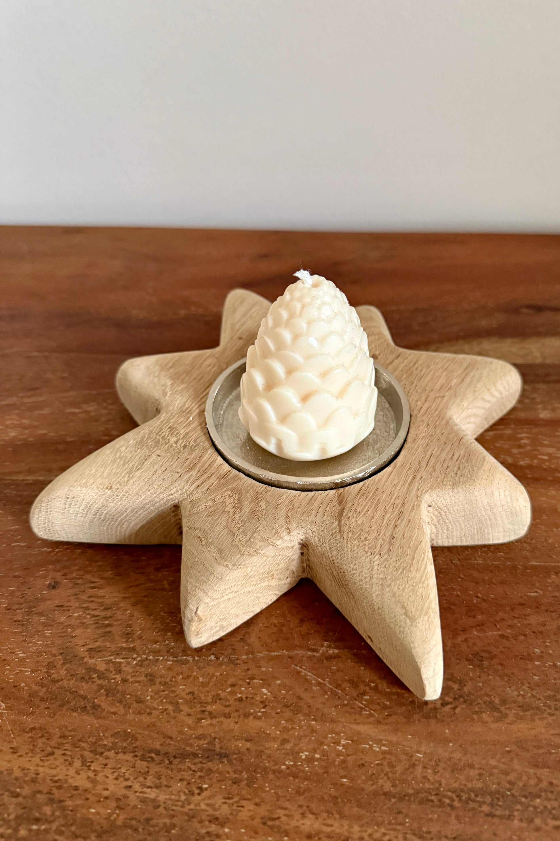 Material: Eichenholz, Material Kerzenteller: Aluguß silber, Material Kerze: Rapswachs