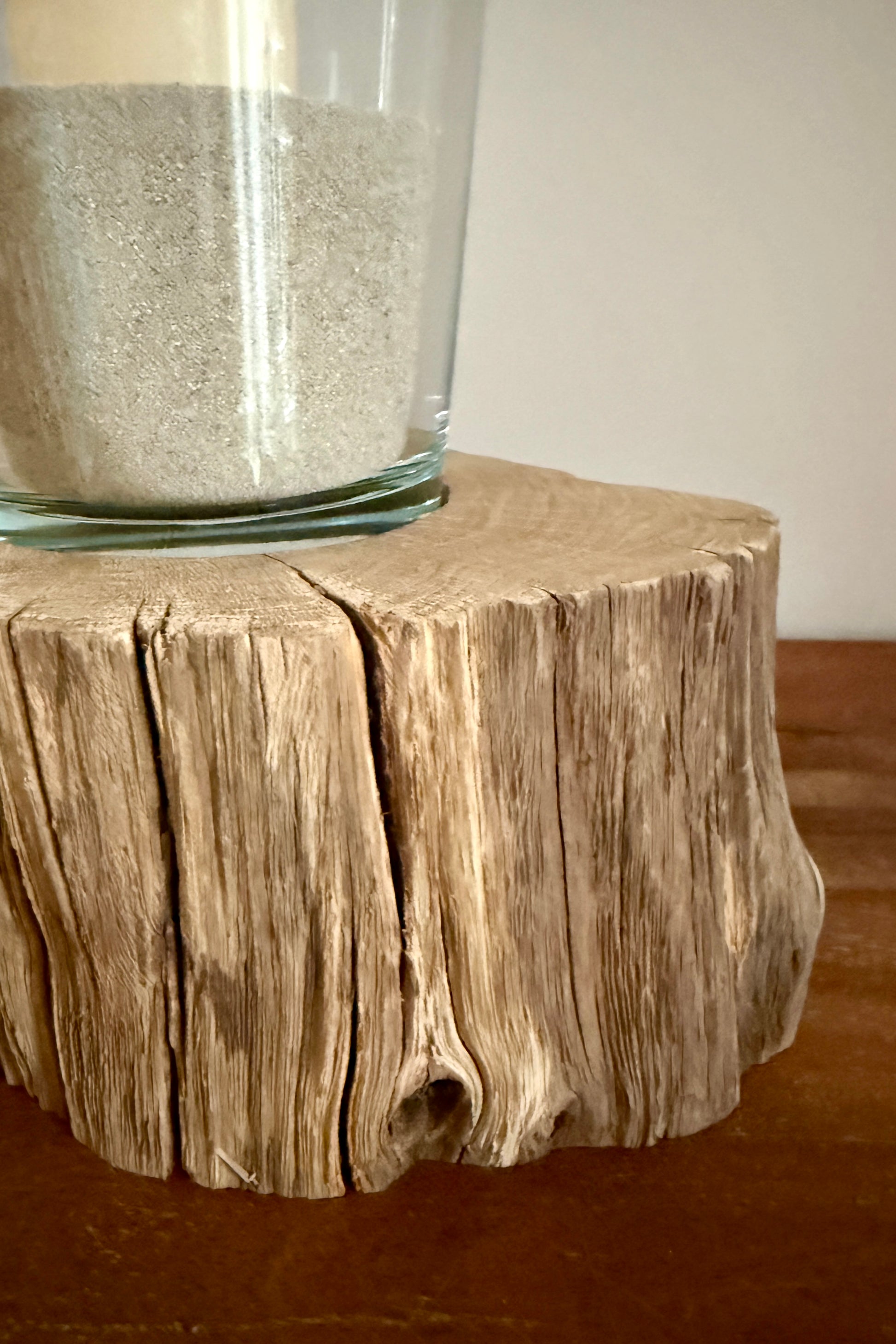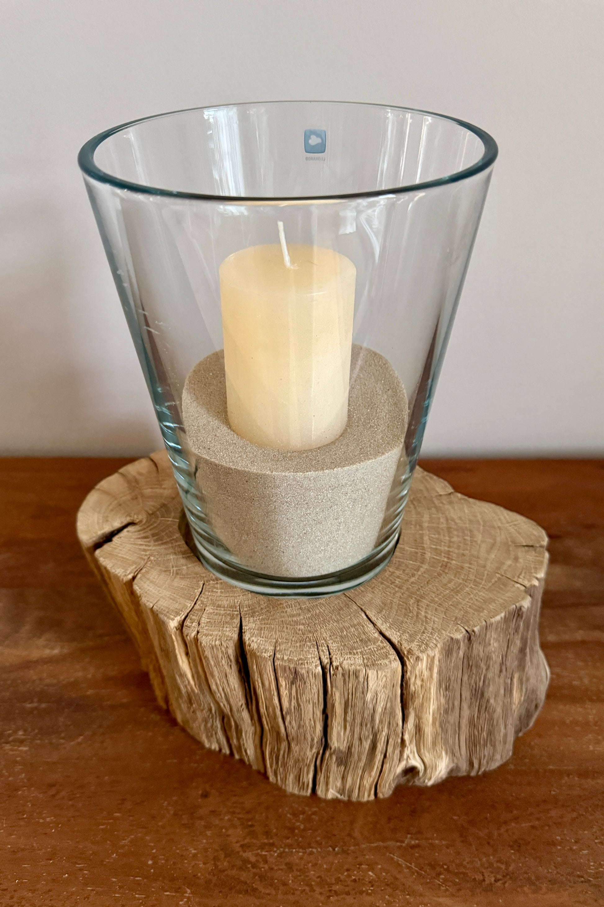 Windlicht Glas auf Holzstamm gebürstet mit Stumpenkerze 1128